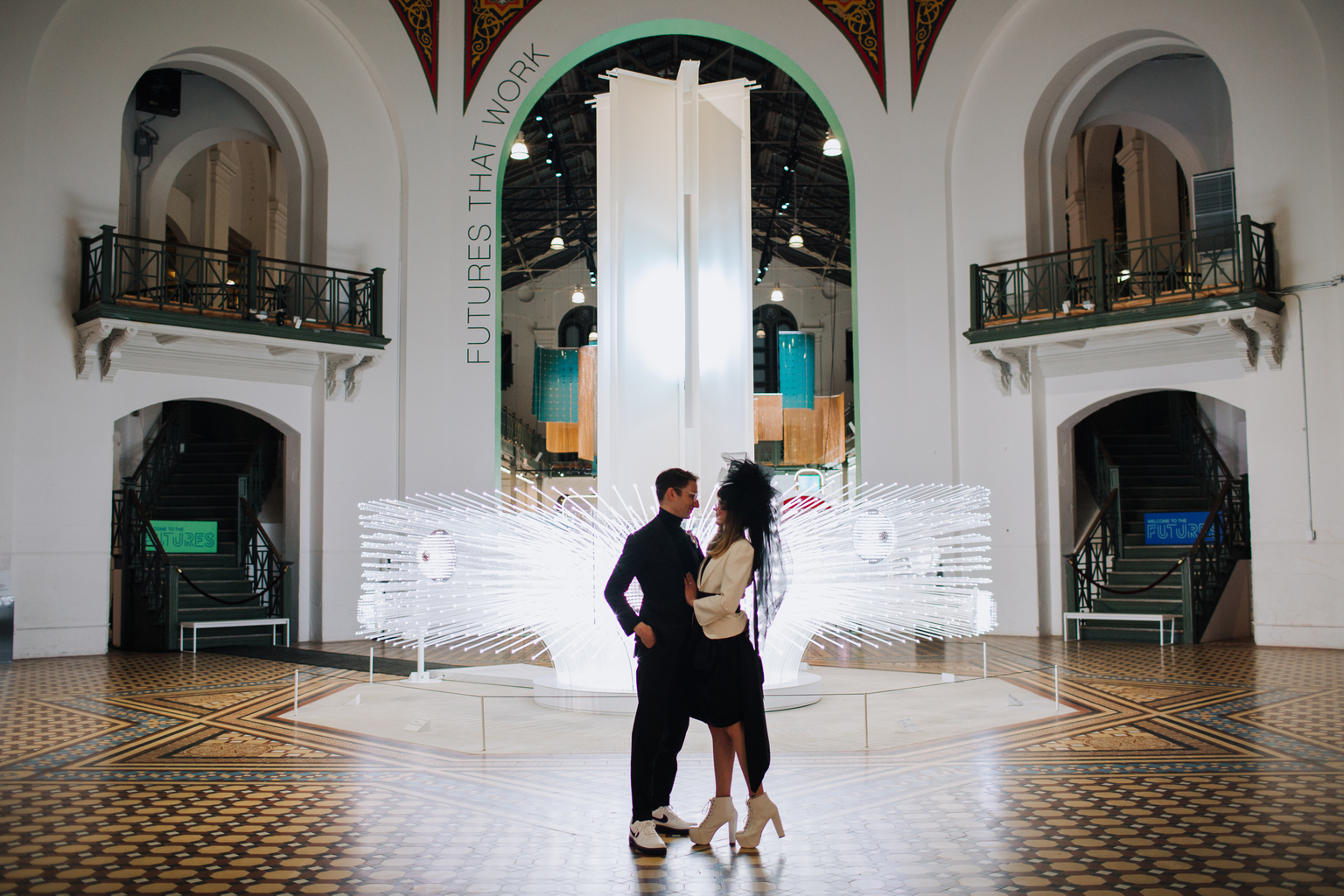 Justin had collaborated with Suchi for 18 months on the technology inside the sculpture, which had just launched at the historic Smithsonian Arts + Industries building. Dawn had the idea that we could embrace the spirit of Me + You (and the larger exhibit called "FUTURES"), which was meant to imagine positive futures between humanity and technology. The sculpture responded to visitors' spoken input of "My future is ______" with a one-of-a-kind lighting animation. We took this opportunity to declare our love and commitment to each other by saying "My future is Dawn" and "My future is Justin". This was our modern version of saying "I do" in a unique and beautiful setting.
